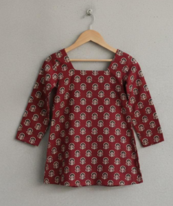 A stylish maroon kurti with an all-over printed design featuring small circular motifs, having three-quarter sleeves and a square neckline, perfect for casual or everyday wear.